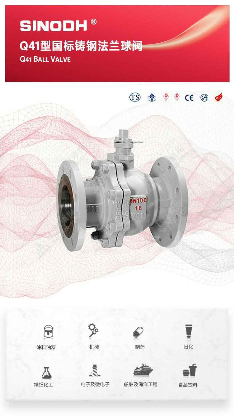Q41型国标铸钢法兰球阀,为开云官方注册-开云kaiyun(中国)自主研发生产。本产品设计制造标准符合GB/T12237、GB/T12224标准。该产品的球体在介质压力作用下球体能产生一定的位移并紧压在出口端的密封面上,保证出口端密封。适用于水、溶剂、酸和天然气等一般工业介质也适用于工况恶劣的介质,如氧气、过氧化氢、甲烷和乙烯等介质。